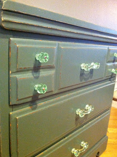 For sale is a perfectly sized, three drawer, farmhouse shabby chic dresser. It is a very sturdy piece, has dovetail drawers, and has some wear which adds to its character! I have painted it pleasing grey with soothing green undertones, which has been accented with beautiful depressed green glass knobs and handles. It measures at 30 3/4'' High x 30 3/8'' Wide x 16 1/4'' Deep. $99.00 for local pick up in Tempe, AZ. Cash only.