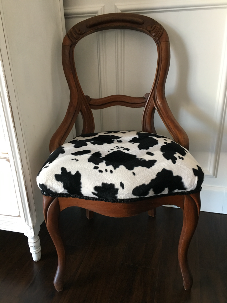 For sale is a lovely antique balloon back chair with faux cow print upholstered seat. This piece will go great with any home decor.